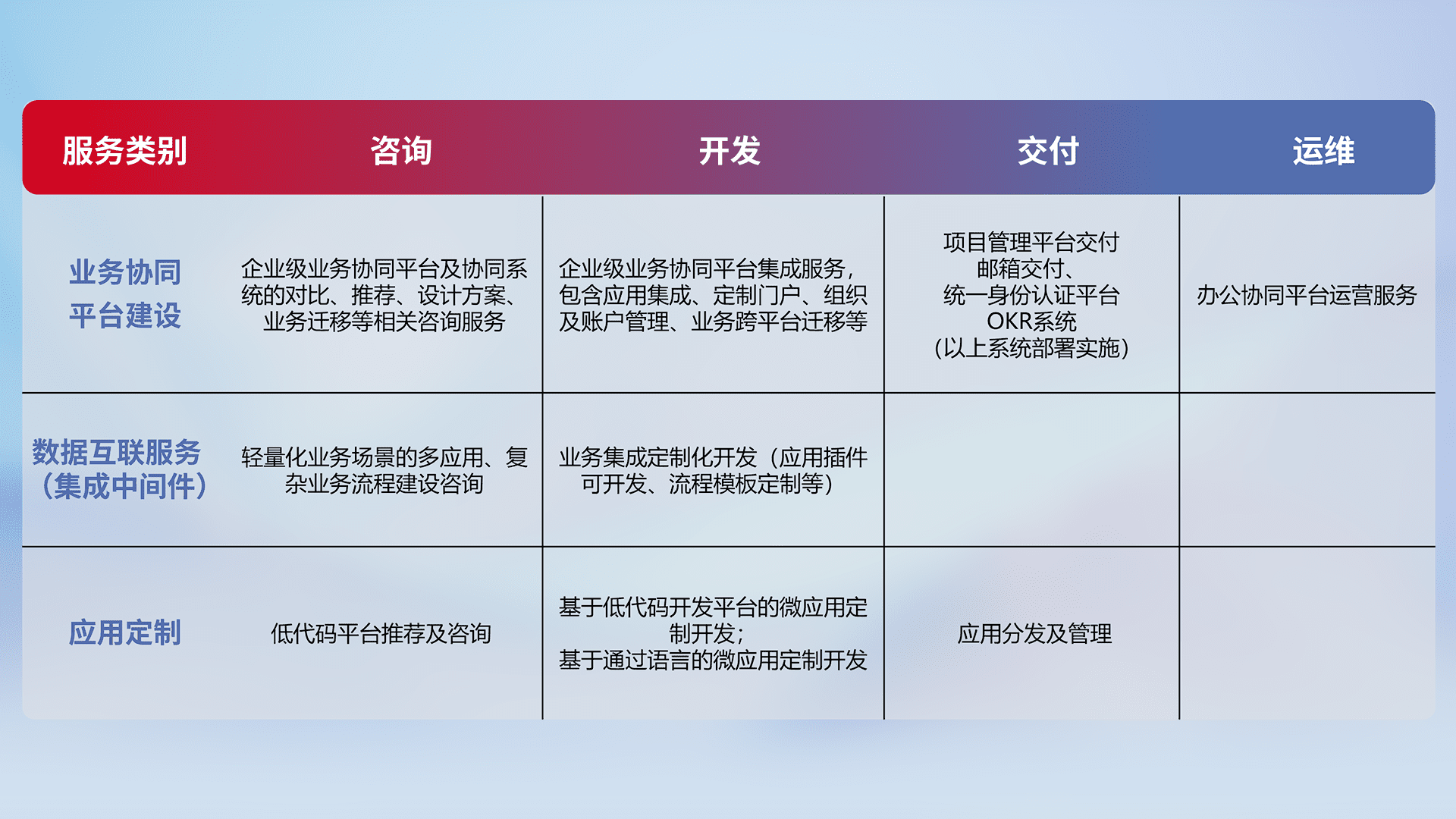 针对钉钉、、、、企微、、、、IDaas等平台级产品提供产品的规划、、、、方案、、交付、、、、定制化开发等服务,,,,实现如统一协同办公、、、、智能客户服务、、、、混合会议管理、、、智能数据查询、、等业务场景,,,实现数字化转型。。