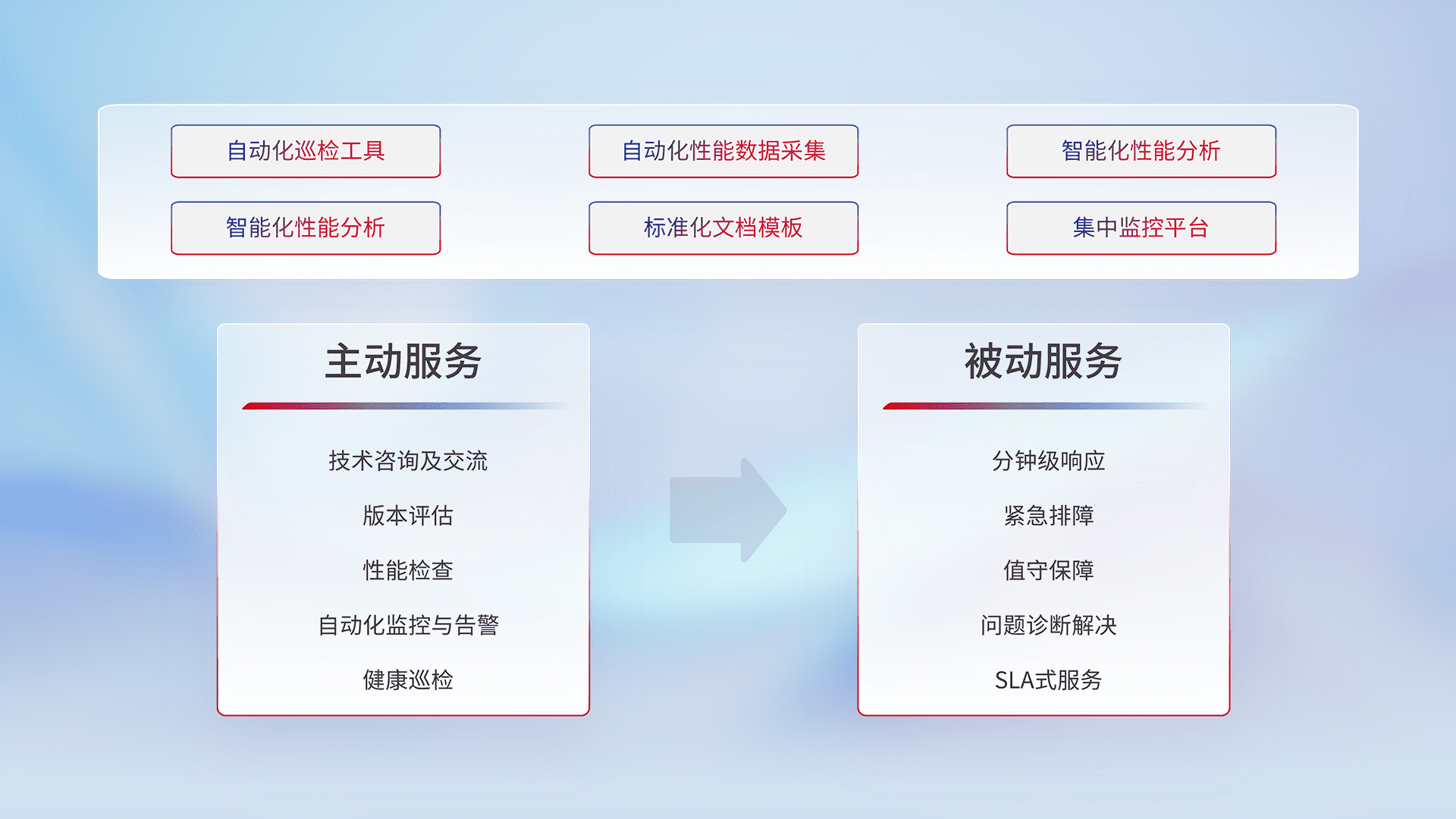 智能化工具和标准化文档,,,保障服务质量,,提供主动服务(包含技术咨询、、、、版本评估、、性能检查、、、自动化监控与告警、、、、健康巡检)和被动服务包含(分钟级响应、、、、紧急排障、、、、值守保障、、、、问题诊断解决、、、、SLA服务)。。。